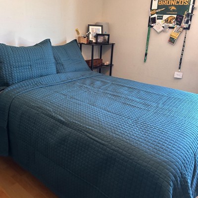 Woven of brushed microfiber for an ultra-soft, smooth feel, this quilt set adds an extra layer of style and warmth to any bed and is available in a range of pastel and dark colors. Crafted of 110-gsm weight for durability with ultra-soft hand feel and features box square quilting pattern to coordinate with variety of bedding. Set includes one oversized quilt and two shams (one in Twin size). Machine washable for easy case.