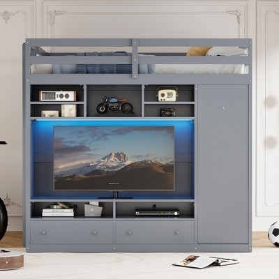 Twin Over Full Wooden Bunk Bed with Desk/Wardrobe, LED Light & Storage Space, White + Orange - ModernLuxe