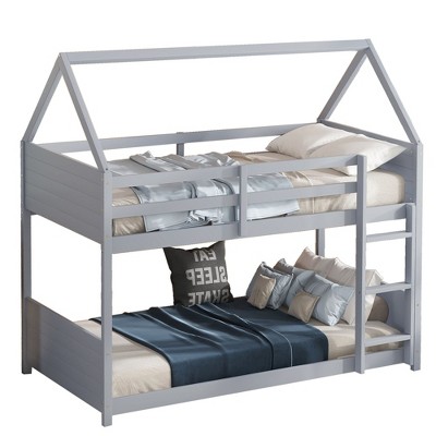 Twin Over Twin House Bunk Bed with Headboards, Ladder and Safety Guardrails