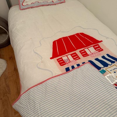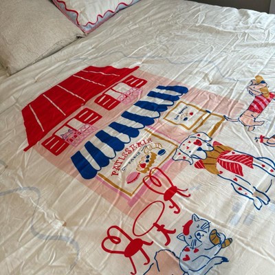 Bring playful charm to your child's bedroom with this Patisserie Scene Comforter Set from Pillowfort™. This multi-piece bedding set includes a comforter with soft polyester fill and coordinating one or two pillow shams, all adorned with a vibrant patisserie scene on a white backdrop. Plus, the blue-and-white striped reverse side and red-and-white striped piping add charming details. Made from 100% cotton with 100% cotton backing, the set helps keep them feeling cozy all night long.
