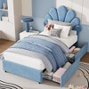 【Ample Under-bed Storage】Two large pull-out drawers are built into the left side of the bed. offering convenient storage for toys. books. or daily essentials. The drawers feature smooth. quiet rollers for easy access. Combined with the under-bed clearance. this bed helps keep the room tidy and is ideal for families with limited space【Adjustable Headboard】This twin bed frame is designed with a double petal headboard that can be adjusted in height to fit different room layouts and preferences. The headboard is wrapped in soft teddy velvet fabric. offering a cozy and luxurious feel. It provides comfortable support for reading or relaxing. making it both stylish and practical【Safe Low-Profile Build】This twin bed frame is designed with a low-profile build. The low height makes getting in and out of bed simple and safe for children. effectively reducing the risk of falls. It is an ideal choice for kids' rooms. guest bedrooms. or minimalist home setups【Sturdy & Noise Free】The bed frame features a sturdy steel frame and wood slats that work together to ensure lasting stability. The floor-standing design and tightly secured slats reduce friction noise effectively. providing a quiet and peaceful sleep environment for your child—no box spring needed【Easy & Quick Assembly】We’ve made setup stress-free! All components are clearly labeled and come with straightforward instructions. With precisely drilled holes and included tools. you can assemble the bed quickly—so your little one can start enjoying their dream bed in no time.