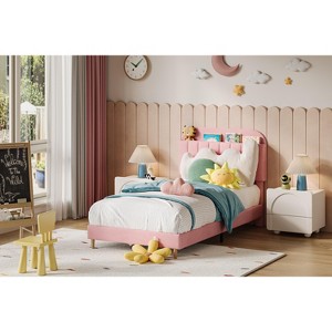 Product DescriptionThis twin bed frame features a convenient bookcase headboard for organized storage of books and toys, perfect for kids’ rooms. Upholstered in soft, luxurious velvet, it offers a cozy and stylish look. Built with a strong metal frame, wooden slats, and 7 legs, it supports up to 890 lbs for lasting durability. Designed for quiet, squeak-free nights, it’s easy to assemble with included hardware and responsive customer support.Product Information