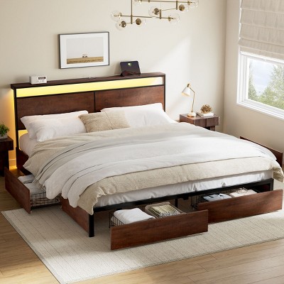 Twin Size Wooden Platform Bed with Two Storage Lockers, Drawer and Storage Shelf