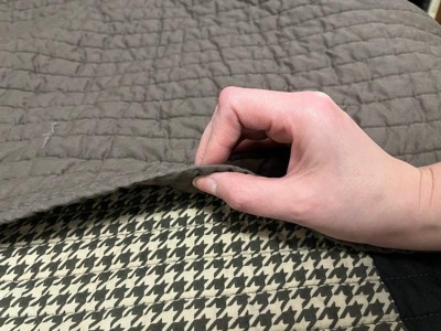 [This review was collected as part of a promotion.] This quilt is pretty thick. It has a beautiful pattern for a masculine bedroom or a spare bedroom. I love the colors in the pattern. (I picked brown plaid.). It’s 90% cotton, machine washable (cold water) and tumble dry. It is made in China.