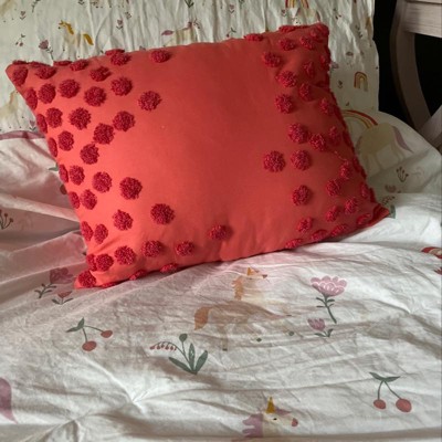 Enhance the look and feel of your kiddo's room with this Unicorn Bedding Set with Sheets from Pillowfort™. This bedding set includes one twin comforter and a matching sham, both featuring a colorful print of unicorns, rainbows, flowers and fruit on a white background, and a decorative red pillow with pompoms. In addition, this decorative bedding set comes with a fitted sheet, a flat sheet and a matching pillowcase showcasing scallop-print rows in a vibrant rainbow-color palette on a white background for a magical look. Each piece in this set is made from 100% cotton shell that feels soft to the touch, while the comforter, sham and pillow feature a soft polyester fill for sleeping or reclining comfort. Use these bedding pieces together, or mix and match them with other bedding sets to create a cheerful look in their bedroom.