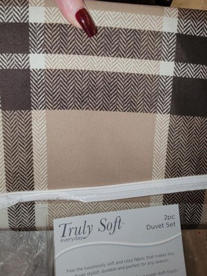A classic plaid pattern is the centerpiece for this collection. The printed pattern features a textured style to provide depth to the pattern. The pattern is dominated by earth tones with browns, khaki and ecru shades. Items feature Truly Soft face and back material with for softness and performance you can count on. Bedding items reverse to a solid brown shade. All items are machine washable. The fabric is 100% brushed microfiber with our special Truly Soft treatment. This item is machine washable, but please be sure to use appropriate sized machinery to avoid any excess wear on the items. Includes: one twin XL duvet cover 68x90 inches with button closure and one standard sham 20x26 inches. Filler comforter must be purchased separately.