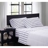 Classic and clean stripes in a standard ticking stripe pattern are a great addition to your bed. The pattern uses a white base with a wider spaced stripe featuring a three stripe pattern with two smaller stripes surrounding a thicker middle stripe. Simple stripes can help you pull together different looks, or they can be used to bring life to an all solid bed. This collection features deep pockets to fit thicker mattresses. Each item in the set is made from 100% microfiber polyester yarns in a percale weave and printed. This item is machine washable, but care should be taken to wash in appropriate size equipment to avoid damage. Includes: one fitted sheet 39x80 inches with 13 inch pocket to fit up to a 15 inch deep mattress, one flat sheet 69x102 inches, and one pillowcase 20x32 inches.