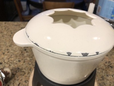 Twine 5998 Farmhouse Kitchen Enamel Cast Iron Fondue Set Cheese Melting Pot Metal Stand with Stainless Steel Forks and Chrome Gel Burner, Off-Cream