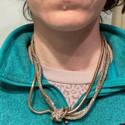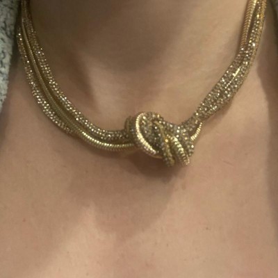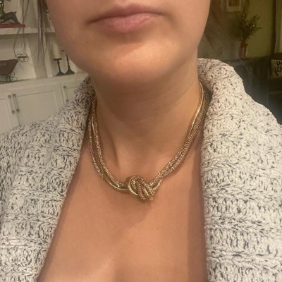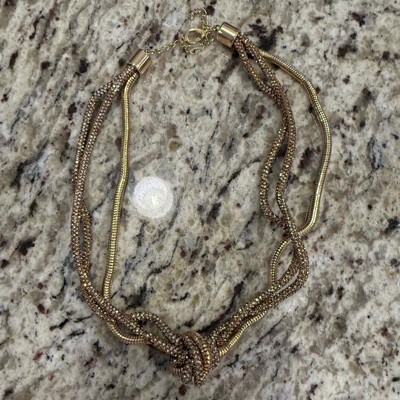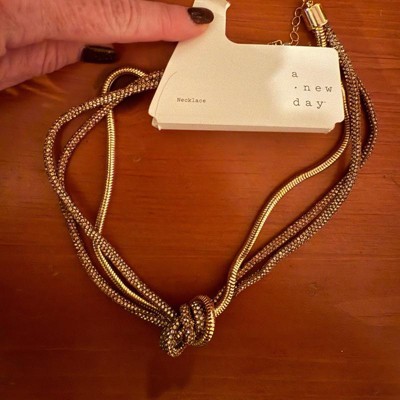 Elevate your accessory game with this Twisted Knot Necklace from A New Day™. This 16-inch necklace features a three-strand design in a gleaming gold finish with two thick rope-like sparkly chains and a snake chain that are gathered to form a twisted knot at the center front, adding a statement look to any outfit. The secure lobster claw clasp closure ensures comfortable wear, while the three-inch extender allows for versatile length options. Plus, the nickel-free construction makes it suitable for most skin types.