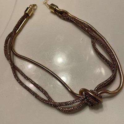 [This review was collected as part of a promotion.] I was very excited to try on this item, hoping to wear it for a holiday party. However upon receiving it, I was disappointed in the cheap feel it felt around my neck. There is very little weight to this necklace and the shape surrounding the knot almost gives off a messy appeal. The color gold is evident but the shimmer is dull.
