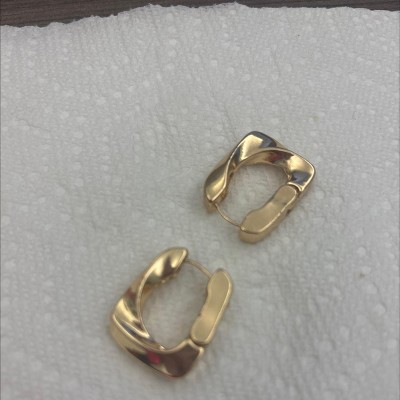 A: The earrings have a twisted rectangular hoop design with a gold finish.