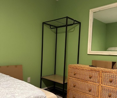 - Organizes clothes, shoes, bins and more with hanging and shelf space
