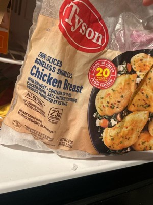 There's nothing like cooking from scratch, especially when starting with Tyson Individually Frozen Thin Sliced Boneless Skinless Chicken Breasts. This all-natural* chicken is juicy and tender with 23 grams of protein and 0 grams of trans fat per serving. Perfect for grilling and roasting, simply cook and serve the boneless chicken breasts with BBQ sauce for a quick and delicious weeknight dinner. Includes one 2.25 lb package of individually frozen chicken. Everything seems to turn out a whole lot better when kept simple. No nonsense. Just stick to the good stuff. The 100% real stuff that makes life, and chicken, great. *Minimally processed, no artificial ingredients.