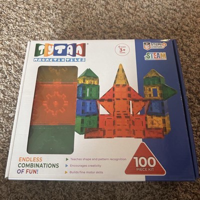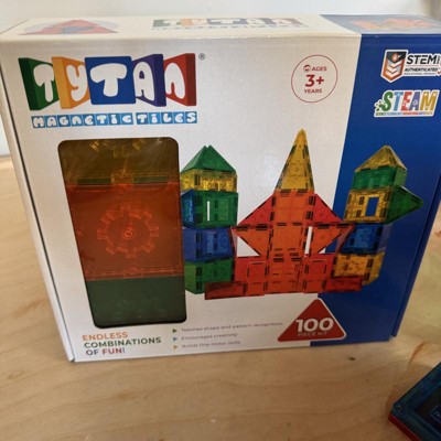 - TYTAN TOYS MAGNETIC TILES 100pcs KIT - Unleash creativity with 100 tiles of various shapes and sizes, kids are able to build anything their mind imagines through creative play. With a simple click, these magnetic learning tiles can bring to life 1000s of different creations. Each tile has a unique ability to attract magnetically together, even when flipped to and from various sides. The wheeled base also makes it possible for the blocks to turn into moveable 3D vehicular structures.