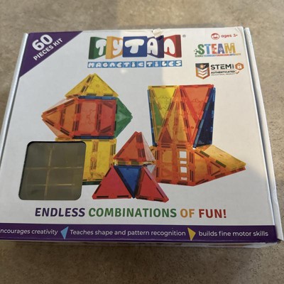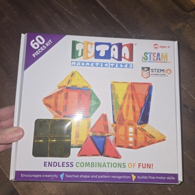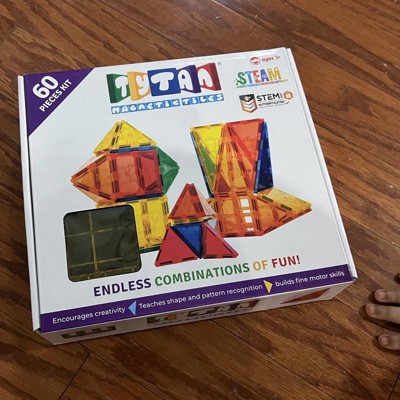 - TYTAN TOYS MAGNETIC TILES 60pcs KIT - Unleash creativity with 60 tiles of various shapes and sizes, kids are able to build anything their mind imagines through creative play. With a simple click, these magnetic learning tiles can bring to life 1000s of different creations. Each tile has a unique ability to attract magnetically together, even when flipped to and from various sides. The wheeled base also makes it possible for the blocks to turn into moveable 3D vehicular structures.