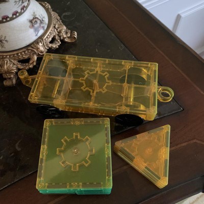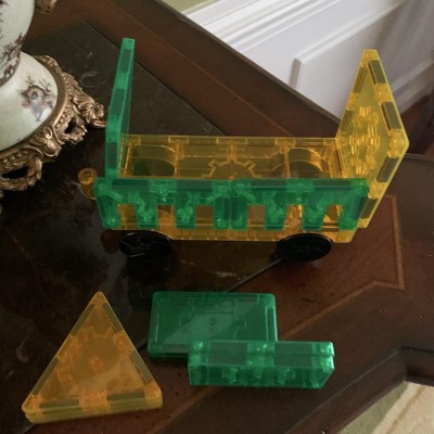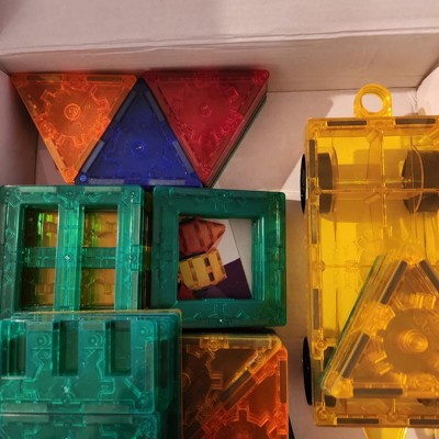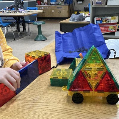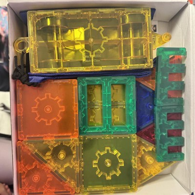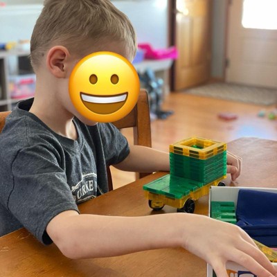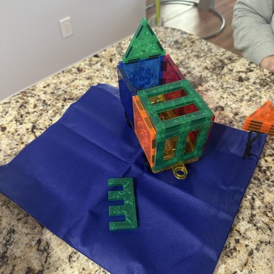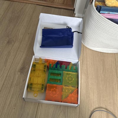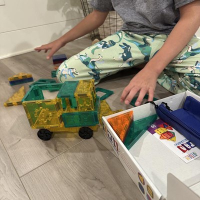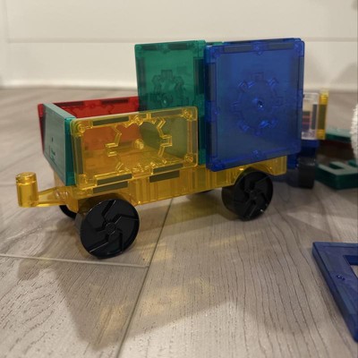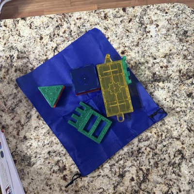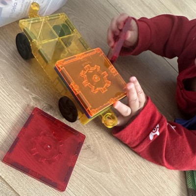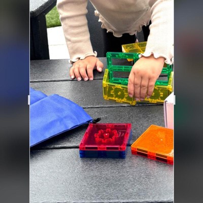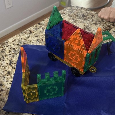[This review was collected as part of a promotion.] This magna tile set is very colorful and contains different shapes and sizes to build with. My five year old son loves the piece that is a flatbed on wheels. He constructs all kinds of different trucks and machines. This set is nice because it contains a dress string bag to store everything inside. This makes for easy clean up and a happy mom. The bag also makes it easy to travel with. I received an incentive to write this review.