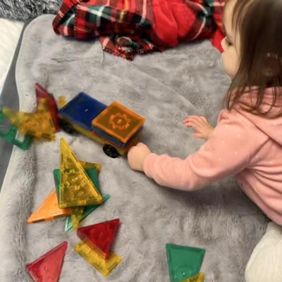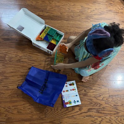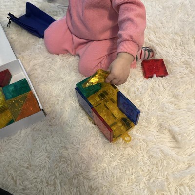 [This review was collected as part of a promotion.] This is a great gift to give for any busy toddler to imagine and play with these magnetic tiles with bright clear and colorful primary colors it comes with a great booklet that shows how many of each shape is needed to construct several fun and imaginative items. It comes with a travel bag so you can take the tiles on the go or keep them seperate from other kits to not mix up and able to have the right amount of shapes to follow the booklet. Definitely age appropriate since easy to use I received an incentive to write this review.