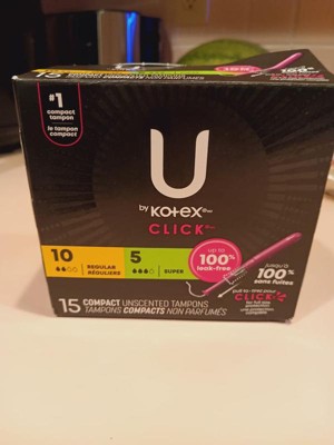Get up to 100% leak-free with the #1 compact tampon, U by Kotex Click tampons move with you for outstanding comfort and are MADE WITHOUT fragrance. Our tampons are gynecologist tested & made without fragrance, pesticides, BPA and elemental chlorine rayon. These tampons are compact to fit in your purse or pocket on the go. To use, pull until you hear the click for full-size protection in one easy step. U by Kotex tampons for women are individually wrapped in vibrant colors and patterns inspired by the latest fashion trends. Click compact tampons are available in regular, super and super plus absorbencies U by Kotex Click tampons are FSA, HSA, HRA-eligible in the U.S.