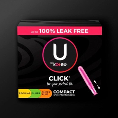 Get up to 100% leak-free with the #1 compact tampon, U by Kotex Click tampons move with you for outstanding comfort and are MADE WITHOUT fragrance. Our tampons are gynecologist tested & made without fragrance, pesticides, BPA and elemental chlorine rayon. These tampons are compact to fit in your purse or pocket on the go. To use, pull until you hear the click for full-size protection in one easy step. U by Kotex tampons for women are individually wrapped in vibrant colors and patterns inspired by the latest fashion trends. Click compact tampons are available in regular, super and super plus absorbencies U by Kotex Click tampons are FSA, HSA, HRA-eligible in the U.S.