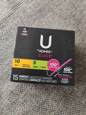 Get up to 100% leak-free with the #1 compact tampon, U by Kotex Click tampons move with you for outstanding comfort and are MADE WITHOUT fragrance. Our tampons are gynecologist tested & made without fragrance, pesticides, BPA and elemental chlorine rayon. These tampons are compact to fit in your purse or pocket on the go. To use, pull until you hear the click for full-size protection in one easy step. U by Kotex tampons for women are individually wrapped in vibrant colors and patterns inspired by the latest fashion trends. Click compact tampons are available in regular, super and super plus absorbencies U by Kotex Click tampons are FSA, HSA, HRA-eligible in the U.S.