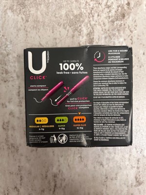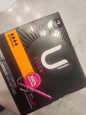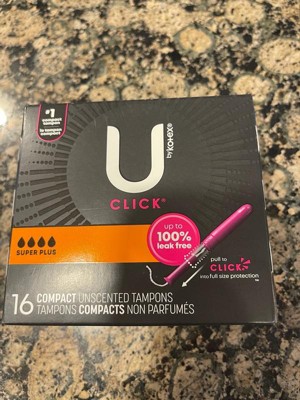 Get up to 100% leak-free with the #1 compact tampon, U by Kotex Click tampons move with you for outstanding comfort and are MADE WITHOUT fragrance. Our tampons are gynecologist tested & made without fragrance, pesticides, BPA and elemental chlorine rayon. These tampons are compact to fit in your purse or pocket on the go. To use, pull until you hear the click for full-size protection in one easy step. U by Kotex tampons for women are individually wrapped in vibrant colors and patterns inspired by the latest fashion trends. Click compact tampons are available in regular, super and super plus absorbencies. U by Kotex Click tampons are FSA, HSA, HRA-eligible in the U.S.