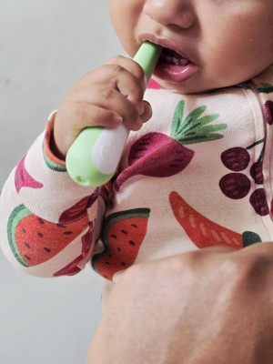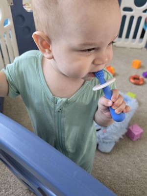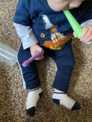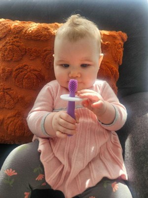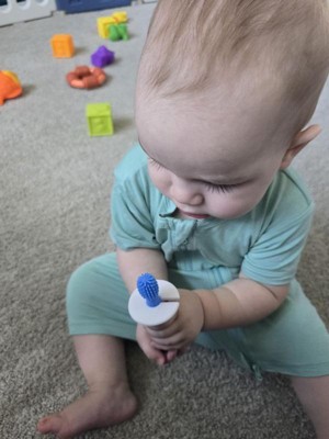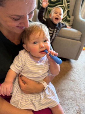 [This review was collected as part of a promotion.] Love the large handles for the baby to be able to hold on to the tooth brush set. I used the one without bristles as a chew toy for the baby. He recently got a couple teeth and had been “practicing” with the toothbrush. The bristles are super soft which I love. Edges are all smooth and rounded. The spiky one also does collect some hair from the floor but it’s so easy to clean!