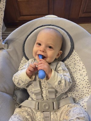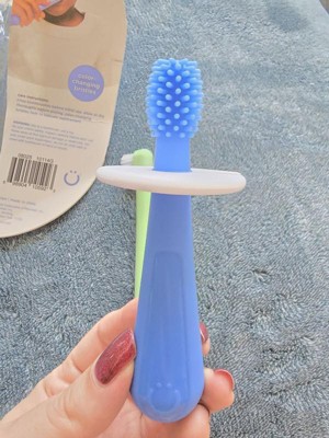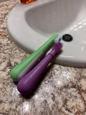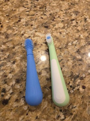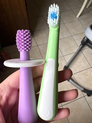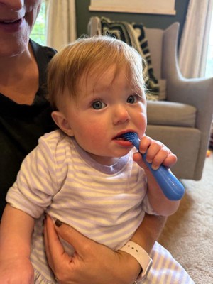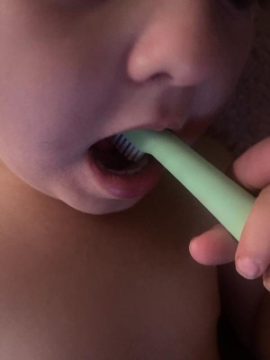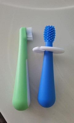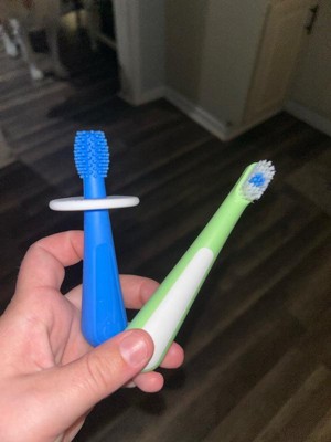 [This review was collected as part of a promotion.] This is the absolute best toothbrush. There are two so that you can use them for different stages. The blue one is absolutely perfect for the teething age when there are only a few teeth! My baby loves it! It is so hard to brush their teeth when they are this little and so this does the job for you preparing them for using a real toothbrush. The green one is so cute and my baby can hold it alone! Great set.