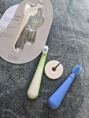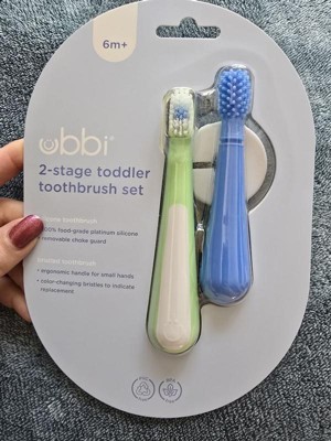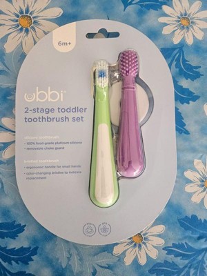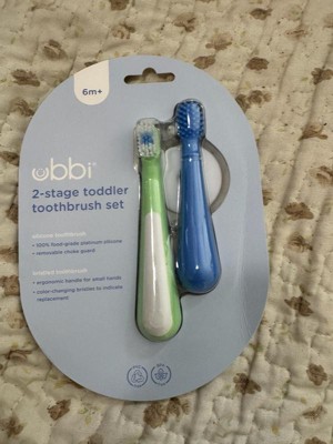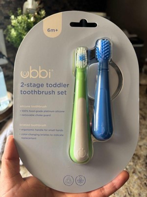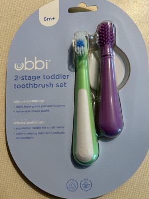 [This review was collected as part of a promotion.] Now that babygirl got her first 2 teeth, it is important to start practicing healthy habits. Ubbi has the perfect 2-stage toddler toothbrush set. The set includes a silicone brush and a bristled brush. The silicone brush is great for cleaning new teeth and yet gentle enough for baby gums. The bristled brush is great quality and the bristles change color when a replacement is needed.