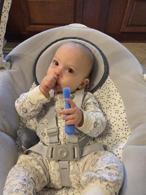 - Silicone Training Toothbrush: The 100% platinum silicone toothbrush is perfect for teething babies. The 360-degree soft bristles gently massage baby’s gums while cleaning from every angle. It features a removable choke guard to prevent gagging.