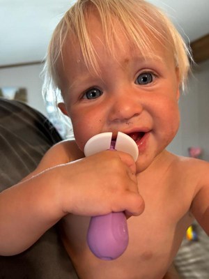 [This review was collected as part of a promotion.] Love the infant toothbrush for my baby who just got her first teeth. Baby is able to easily hold it in her hand. There’s a little ring that you can put on it so baby doesn’t choke on it and it’s super cool that it comes with a toddler toothbrush too.
