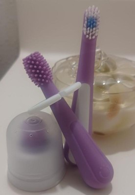 - Stage 2 Training Toothbrush: Transition to the silicone handheld training toothbrush for babies. With a removable choke guard to prevent gagging and 360-degree silicone bristles; gentle on baby’s first teeth. Use the included case to cover the toothbrush for travel, and the stand to store your toothbrush upright.