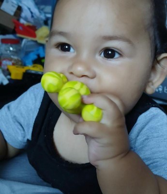 [This review was collected as part of a promotion.] This is a really cool baby teether toy. Our nephew just turned 7 months and has been teething so we found this and it's fun and relieving for him. It helps with hand/eye coordination and color identification and is built to last with platinum silicone. Very impressed and looking forward to trying out other products from this brand