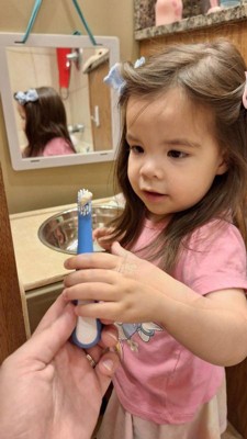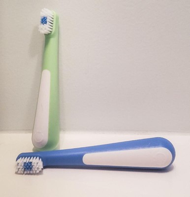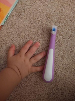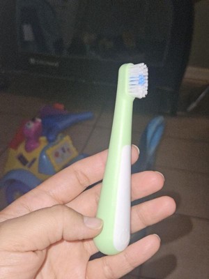 [This review was collected as part of a promotion.] This toothbrush is cute and comes in a two pack. The bristles are soft and the handle is definitely toddler friendly. But the head is a bit big which my dentist friend said would make it hard to reach in enough places in a small toddler mouth.