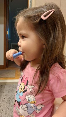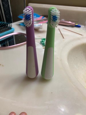 [This review was collected as part of a promotion.] I love that this comes in a 2-pack. We run through toothbrushes due to my toddler feeling the need to chew on her toothbrush rather than brush. They're different colors which also gives her that good feeling of making a choice that suits her. The handles are comfortable and easy to grip. They're the perfect size for her little hands. The bristles are soft enough on her gums yet I still feel confident they're doing their job of cleaning her teeth. My daughter is always asking to brush her teeth now and never wants to stop!