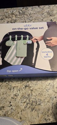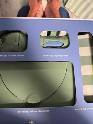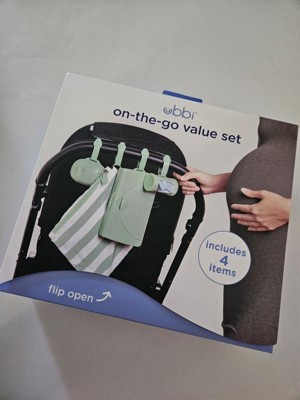 - The on-the-go gift set contains all the on-the-go necessities: changing mat and bag, wipes dispenser, pacifier holder and bag dispenser.