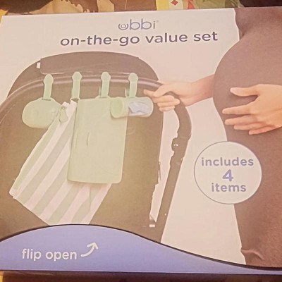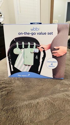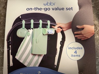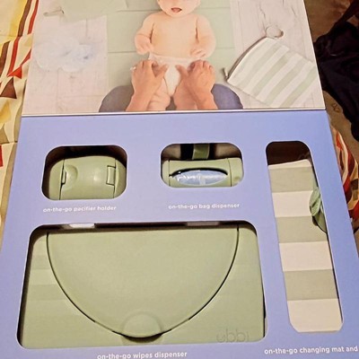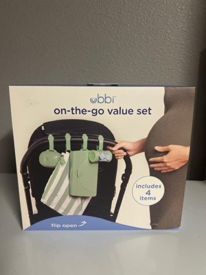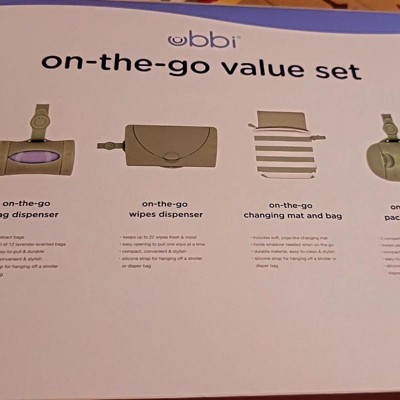 The Ubbi On-the-Go Gift Set contains all the on-the-go necessities needed for a busy parent out and about! It includes a changing mat and bag, wipes dispenser , pacifier holder and bag dispenser. The soft, yoga like mat and bag can hold a few diapers, travel size wipes dispenser as well as your phone, or keys! Also included is a bag dispenser that turns to retract, allowing bags to be quickly reinserted and easily torn for use - and they're lavender scented to keep stinky diapering odors at bay. The dual pacifier holder is perfect for storing double the pacifiers without cross contaminating them if one is dirty. Last but not least, the wipes dispenser makes for quick and easy on-the-go changes while keeping wipes moist and fresh. Each item in the gift set comes with a bonus silicone strap for easy hanging off of a diaper bag or stroller and the gift set is ready to be gifted, so no wrapping needed! About us: Ubbi is a globally recognized brand, designing innovative and creative products with parents and children in mind. Under the Ubbi name, you will find unique, quality products that are easy to use, and simplify parents' lives while keeping babies happy and safe as can be. Our steel, odor locking diaper pail was a first on the market in 2011, and has become our flagship item. With the same customer focused philosophy and innovative design capabilities, we have expanded into a variety of product categories: feeding, modern and trendy on-the-go items, bath toys and functional accessories. From concept to final creation, the Ubbi team works together every step of the way to bring the best in design and value.