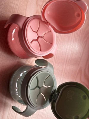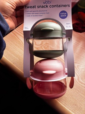 [This review was collected as part of a promotion.] The Ubbi Tweat Snack Containers 2 pack in sage and pink are very cute! They look like little birds. The construction is high quality and survived the many drops from my baby. She wasn't as interested in using it. I showed her how and she tried a few times then gave up. It comes in a 3 piece design which is easy to clean but I was not a fan of reattaching the middle piece. They have handles that are easy to hold and seem mostly spill proof depending on what is inside as far as snacks. If nothing else it could be a bath toy.