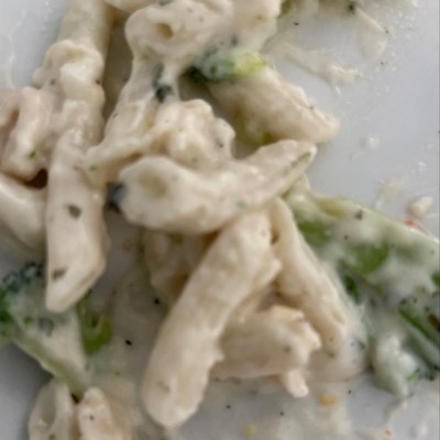 - Gluten free penne pasta tossed with grilled chicken, broccoli, cream sauce and cheese