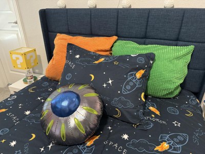 A: The pillow is shaped like a UFO, adding a fun, space-themed touch.