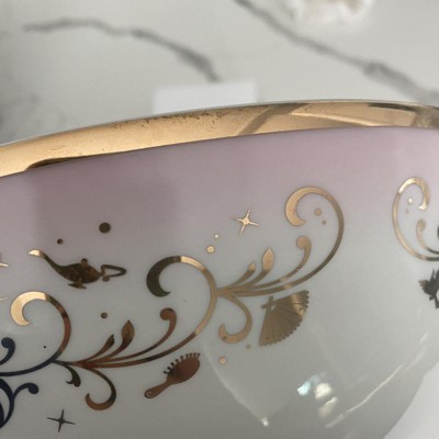 - SOPHISTICATED DESIGN: White 10.5-inch serving bowl features an elegant scrolling gold print around the rim and in the center. Design features numerous Disney Princess icons, including a carriage (Cinderella), scalloped seashell (Ariel from The Little Mermaid), magic lamp (Aladdin's Princess Jasmine), and many more fun surprises! A Princess Crown adorns the middle.