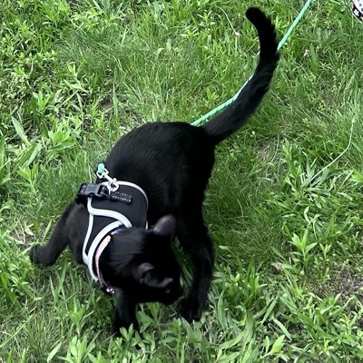 The XS fit my 6 mo. old kitten perfectly with room to grow. He is very comfortable c in it. I really like the vest style. It has a large area of Velcro in back to secure along with an adjustable strap and clip. It feels very secure and safe. He is able to run and jump without being constricted. I also purchased the grey mesh vest style harness by Boots& Barkley.
