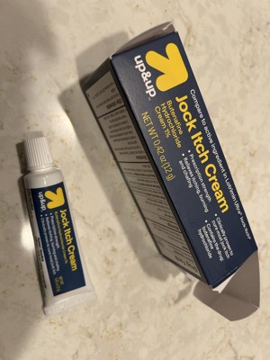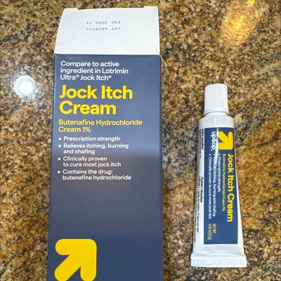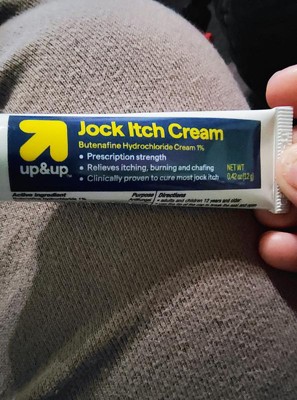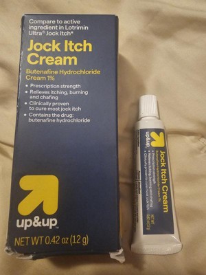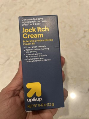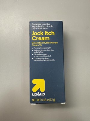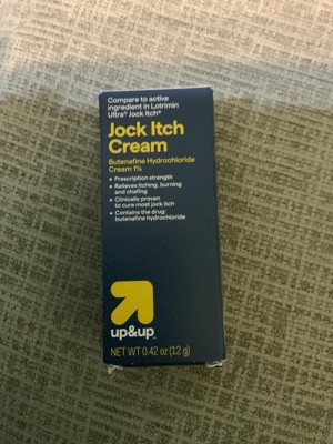 up&up™ Ultra Antifungal Jock Itch Treatment Cream comes in a 0.42oz package. It is comparable to active ingredient in brands like Lotrimin. The active ingredient is Butenafine Hydrochloride Cream 1%. It is prescription strength and clinically proven to cure the condition of jock itch. It relieves the symptoms such as itching, burning and chafing. You use the tip of the cap to break the seal and open the tube. It is easy to apply and you apply once a day to the affected skin.