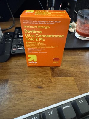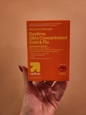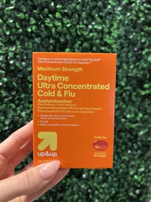 If a cold or flu is getting you down, reach for these 48-Count Ultra-Concentrated Flu Treatment Liquicaps from up&up™. Featuring a maximum-strength formula, these liquicaps help treat symptoms like headaches, fever, sore throat, coughing and congestion. Designed for daytime use, they have acetaminophen as the active ingredient, making them equally helpful for reducing minor aches and pains.