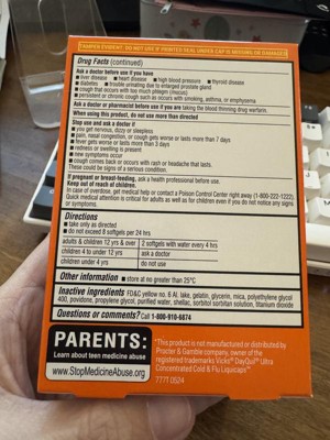 Fantastic product! Works great at helping with cough and nasal congestion with a cold a flu. Not to mention all of those other pesky aches and pains. I love how easy the softgel was to swallow. It was a great size. The medicine lasts a fairly long time and I didn’t feel like I wasn’t worn down between doses.