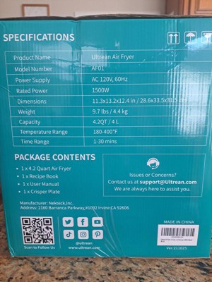 The Ultrean air fryer offers excellent performance and user-friendliness. Its straightforward design requires no initial setup, allowing for immediate operation upon unboxing and plugging in. The device heats up efficiently, and the temperature and timer controls are intuitive. Furthermore, the air fryer is suitable for use by individuals of various ages, including an 8-year-old, making it a versatile tool for collaborative cooking experiences.