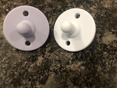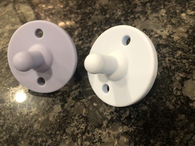 This is a set of two silicone pacifier's, one lilac or purple and the other a light pink. The pacifiers are food grade silicone, BPA free, safe and easy to clean! The baby took to them right away and very easily, i believe they are designed to be more natural feeling, therefore if your baby breastfeeds they should take to this easily as it mimics a real breast. The pacifier doubles as a teether, you can tuck the nipple part away and they can just chew on it as a teether for when the time comes and they start chewing on everything!
