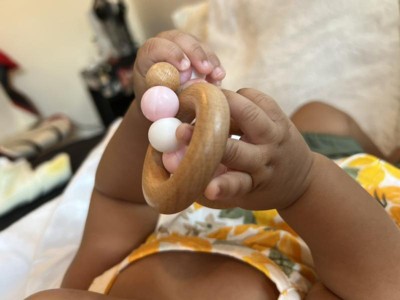 What a great baby entertainer and teething ring. My little one absolutely loves grasping on to this and shaking it. She chews on it nonstop as well. It’s perfect for the car seat and when she’s just hanging out on the floor. It even keeps her content for tummy time a bit longer. I love the look of it and that it keeps her content.