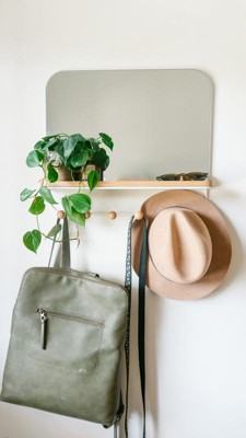 This little mirror was very easy to mount in my bedroom. It looks super cute, makes the tiny space feel bigger, and has just enough room on the ledge for some small plants and a drop zone for pocket clutter. I use the hooks to hang clothes I plan to rewear.