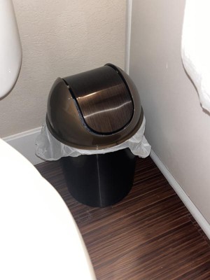 I bought this trashcan when I moved into my new home. It is a perfect bathroom trashcan. It has spin lid that makes it easy to dispose of items, is easy to wash and is a great size. The bronze colour works perfectly with my other accessories. I am pretty sure I am getting one for my kitchen in the grey.
