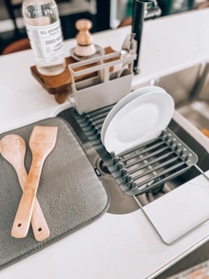 UDry Over the Sink Dish Rack & Drying Mat features an absorbent microfiber dish drying mat with a removable over the sink utensil caddy and dish drying rack. This 2-in-1 dish drying solution provides versatile storage and ample space to quickly dry your dishes and utensils. The bpa-free dish rack can be secured to the middle or side of the microfiber mat to accommodate a wide assortment of dishes with 16 slots to hold and dry your dishes. Alternatively, the removable rack can be placed over your sink, with wire arms that start from 13”(33 cm) and extend to fit up to a 22" (56 cm) sink. The lightweight, low-profile design looks great on your counter-top and accommodates a surprisingly large number of dishes when in use; when not in use, UDry conveniently folds up for compact storage in a drawer or cupboard leaving your counter-top clutter-free. Dishwasher safe (top rack only) for easy cleaning and is BPA-free. Mat is machine-washable.
